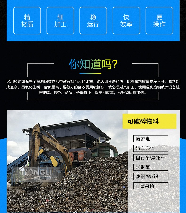 河南通利1280破碎机由主机一台,生产线一条,磁设备一台,输送机一台,电机一台组成,厂家可为您提供系列化的金属破碎机和整个破碎工厂的工艺装配配置。用于破碎轻薄料如汽车外壳混合废金属,包括金属打包块的破碎,机器通过不断、化以及经验的积累,掌握了设计和制造破碎机的技术诀窍,从而设备长期可靠地低成本运行。