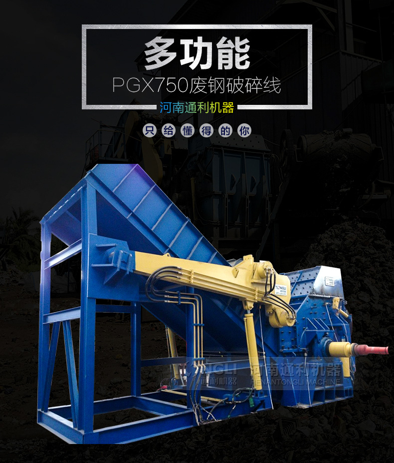河南通利PGS750废钢破碎生产线由主机一台,生产线一条,磁设备一台,输送机一台,电机一台组成,厂家可为您提供系列化的金属破碎机和整个破碎工厂的工艺装配配置。用于破碎轻薄料如汽车外壳混合废金属,包括金属打包块的破碎,机器通过不断、化以及经验的积累,掌握了设计和制造废钢破碎机的技术诀窍,从而设备长期可靠地低成本运行。