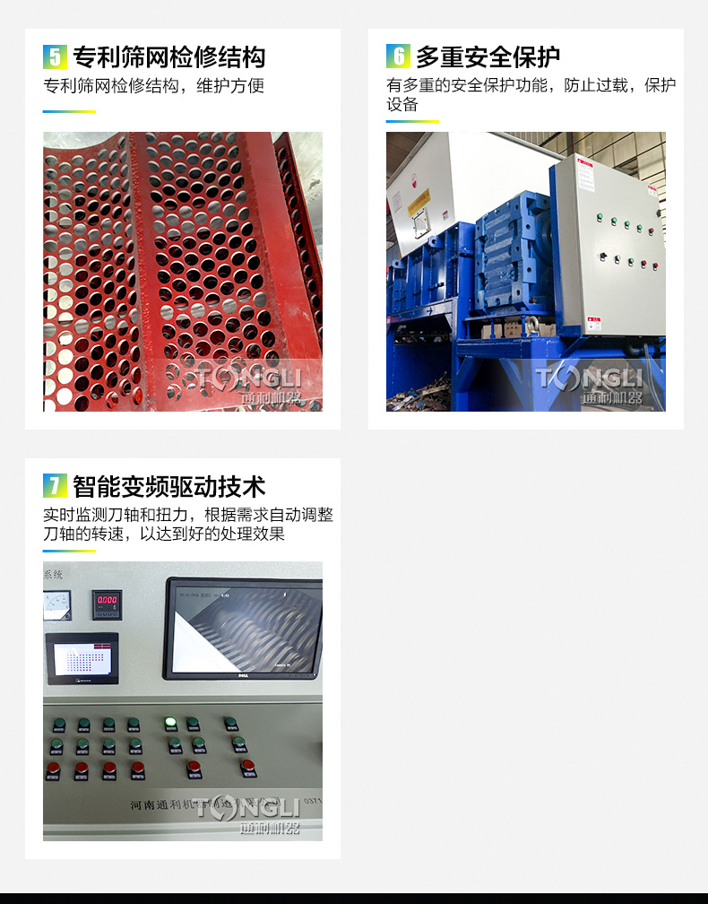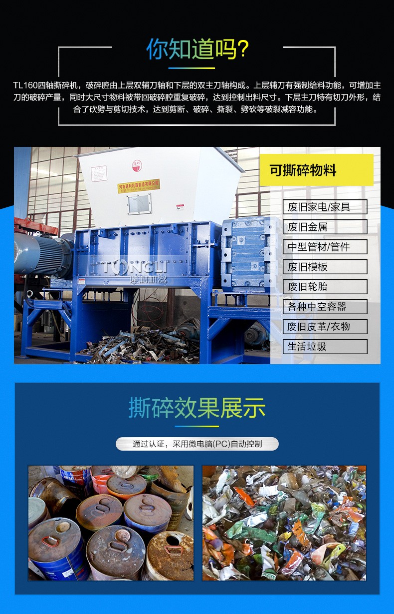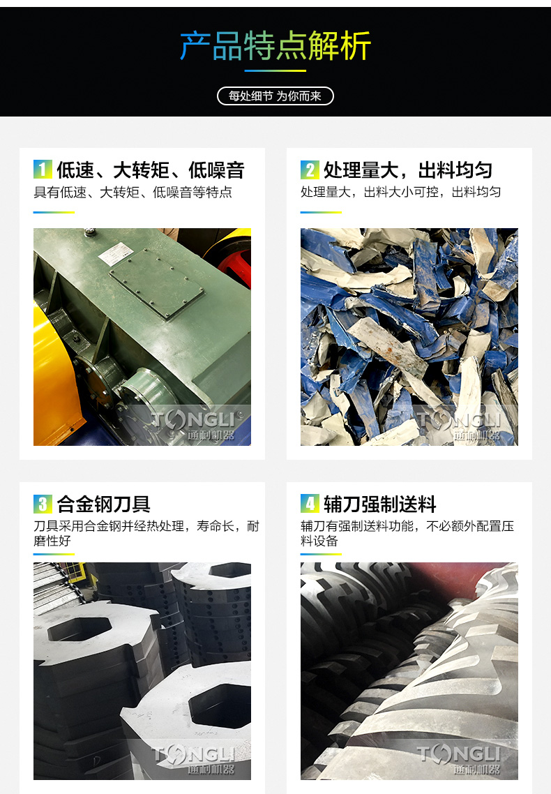 1.设备是由撕碎刀片组、承载箱体、箱体支架、进料系统、动力系统,电器控制系统组成的,可将不合格的产品撕碎成较小片以便于破碎。