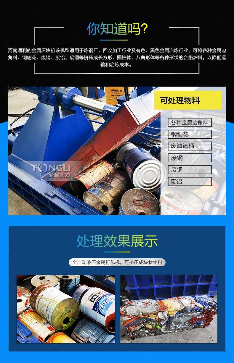 A:机器采用液压传动、结构紧凑、移装方便、操作简单、维修容易、密封可靠、安装时不用底脚螺丝。用户可根据需要自定打包规格、尺寸,以较限度地配合运输或存储,压块后金属方便破碎二次处理,是提劳动效率、减少劳动强度、节约人力、减少运输费用的设备。